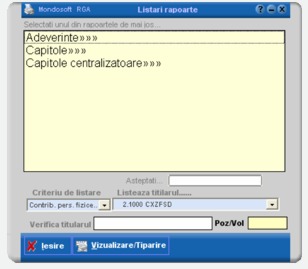 Cu ajutorul acestei aplicaţii se pot obţine: matricole de impunere pentru fiecare categorie de taxă sau impozit, situaţia debitelor şi majorărilor restante, situaţia majorarilor de întârziere la o anumită dată, registru rol unic nominal, registrul de venituri (partida de venituri), fise de venituri pe clasificatia bugetara, lista cu bonificatii, chitanţe fiscale, borderou de încasări, fise de depunere debite, registru banca, centralizator compensari, procese verbale compensari, borderou depuneri si restituiri, borderou de depunere la trezorerie a încasărilor, înştiinţări de plată, somaţii de plată, certificate de atestare fiscală, situaţia încasărilor etc.